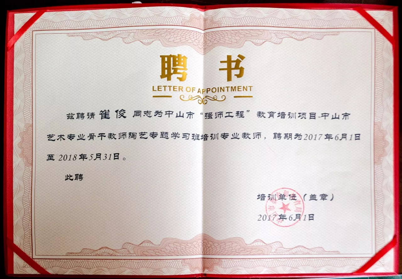 △被聘为中山市艺术专业骨干教师陶艺专题学习班培训专业教师
